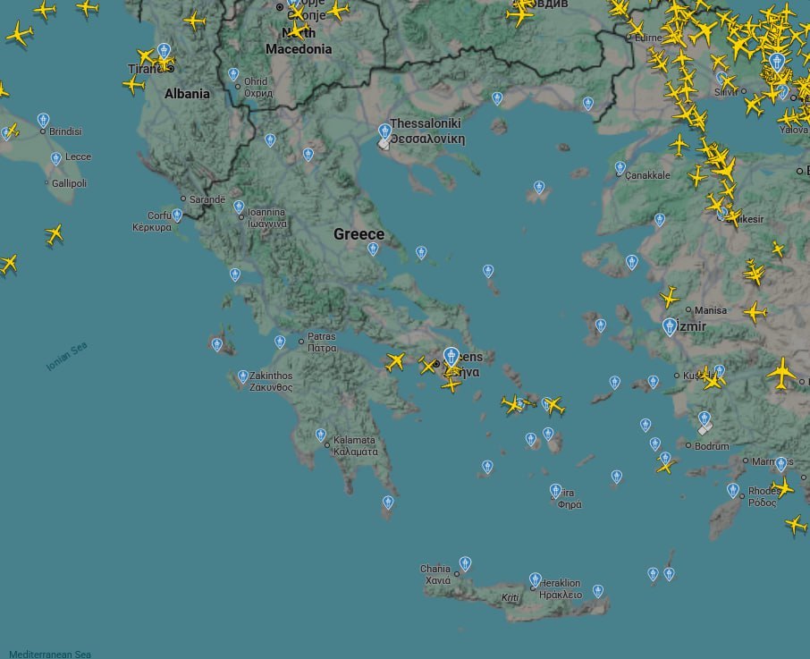 Der Luftraum über Griechenland ist seit dem frühen Sonntagmorgen für den zivilen Flugverkehr vollständig gesperrt. Laut Flightradar befinden sich aktuell nur vereinzelte Maschinen über dem südosteuropäischen Land.