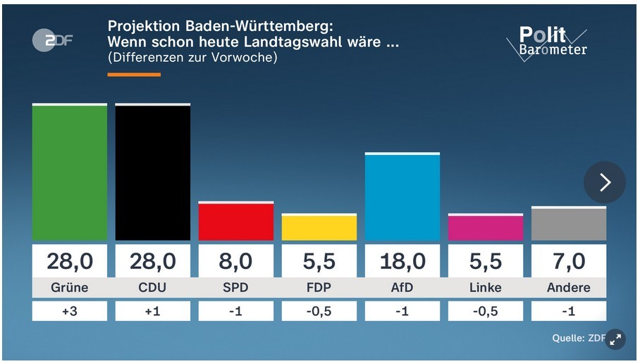 Bei der sogenannten Sonntagsfrage zur bevorstehenden Landtagswahl erhob die Forschungsgruppe Wahlen des ZDF folgende Werte: