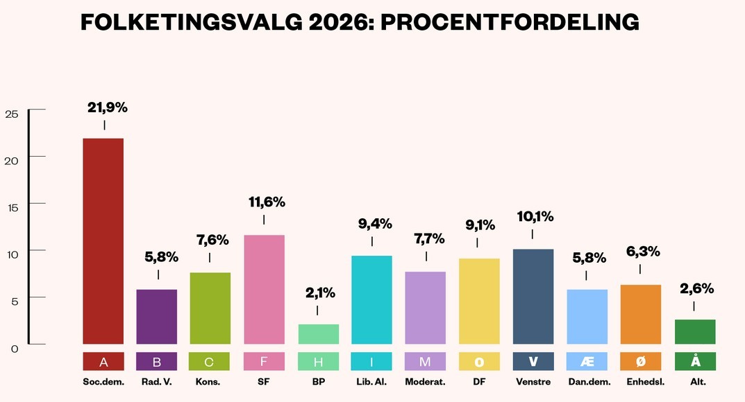 Mit dem vorläufigen Wahlergebnis hat keiner der beiden Blöcke eine eigene Mehrheit von 90 Sitzen im Parlament, in dem zwölf Parteien sitzen werden. Seit dem Jahr 2022 regierte ein Bündnis bestehend aus den Sozialdemokraten, der rechtsliberalen Venstre und der Partei Moderaterne.