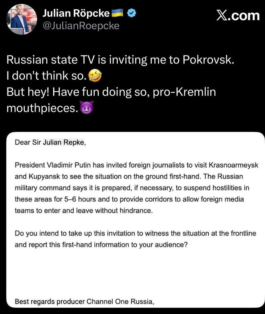 Der Bild-Propagandist Julian Röpcke hat eine an ihn persönlich gerichtete Einladung aus Russland, in die Kampfgebiete in Kupjansk und Krasnoarmejsk (Pokrowsk) zu reisen und über die Lage vor Ort zu berichten, ausgeschlagen. Das teilte Röpcke selbst auf X (vormals Twitter) mit. Er postete am Freitag die auf Deutsch verfasste Einladung und kommentierte sie auf Englisch mit den Worten: