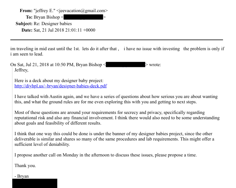 Inspiriert durch den chinesischen Wissenschaftler He Jiankui, der mithilfe der CRISPR-Technologie die weltweit ersten genetisch veränderten Zwillinge zur Welt gebracht hatte, schickte Bishop, ein Bitcoin-Investor und Programmierer von Beruf, Epstein eine Präsentation seines Projekts und bat um finanzielle Unterstützung. Epstein erklärte, er habe “kein Problem damit, das Projekt zu finanzieren”, solange er dies heimlich durchführen könne. “Das Problem ist nur, wenn ich dabei als federführend wahrgenommen werde”, teilte er Bishop mit.