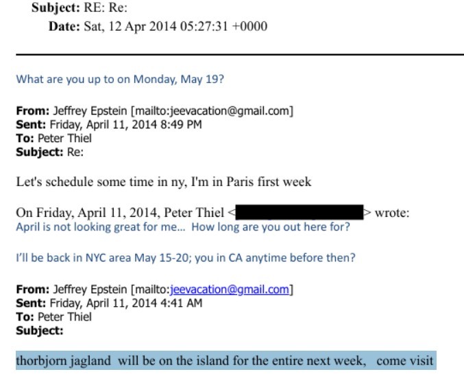 Bleiben wir in Norwegen und Epstein-“Neuheiten”, die in den vergangenen Tagen für die Mainstreammedien nachweislich anscheinend mit Gründen nicht von Interesse waren. Man kann auf der Webseite des US-Justizministeriums Suchbegriffe eingeben. Nach erkenntnisreichen Stunden der Lektüre und Betrachtung von Fotos der New Yorker Wohnung und des Anwesens auf Little St.James findet sich im aktuellen Material folgende Mail an Peter Thiel, Chef von Palantir und aktuell kommender Drohnenlieferant der Bundeswehr.