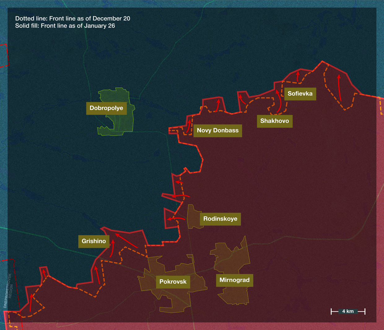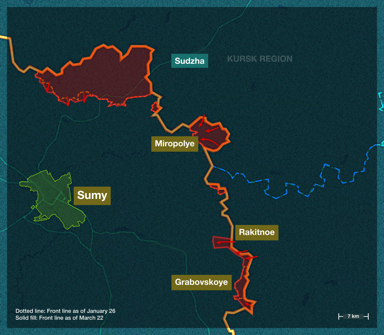 Ende letzten Jahres eröffnete die Gruppe Nord eine neue Front in der Region Sumy durch die Einnahme des kleinen Grenzdorfes Grabowskoje. Seitdem wurde der Stützpunkt ausgebaut: Russische Truppen eroberten das größere Dorf Pokrowka und ein beträchtliches Gebiet nördlich davon nahe dem Dorf Miropolje. Dadurch entstand eine Pufferzone zwischen der ukrainischen Region Sumy und den russischen Regionen Kursk und Belgorod. Diese soll künftig auch Offensiven gegen Rakitnoje verhindern (die ukrainischen Streitkräfte hatten im Zuge ihres Vormarsches auf Sudscha im Jahr 2024 versucht, nach Rakitnoje durchzubrechen).