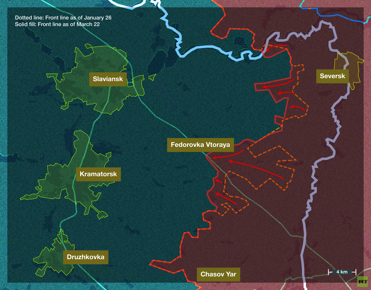Sewersk (eingenommen am 11. Dezember) war ein wichtiger Zwischenstopp auf dem Weg zu einem Schlüsselgebiet im Donbass – dem Ballungsraum Slawjansk-Kramatorsk. Die Gruppe “Süd” der russischen Streitkräfte muss 25–30 Kilometer zurücklegen, um Slawjansk-Kramatorsk zu erreichen, und dabei eine beträchtliche Höhe überwinden. Ein Teil dieser Route wurde bereits zurückgelegt, wobei es den russischen Truppen gelang, die ukrainische Hauptverteidigungslinie in dieser Richtung einzukesseln und heftige Kämpfe um sie zu führen.