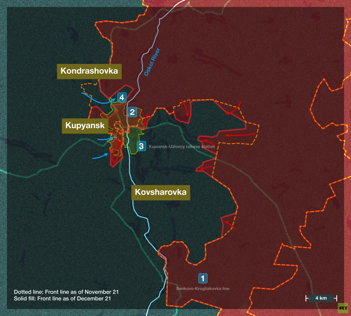 Dnie russische Streitkräfte konnten nördlich von Kupjansk im Gebiet Kondraschowka einen Brückenkopf errichten, befestigen und ausbauen. Südlich der Stadt entlang der Linie Senkowo-Krugliakowka (Nummer 1 auf der Karte) gelang es ihnen jedoch nicht, einen Brückenkopf zu errichten. Im Sommer dieses Jahres schwächten sich die ukrainischen Verteidigungsanlagen in Kupjansk jedoch deutlich ab, was das russische Oberkommando zu dem Entschluss veranlasste, von Norden her in die Stadt einzudringen.
