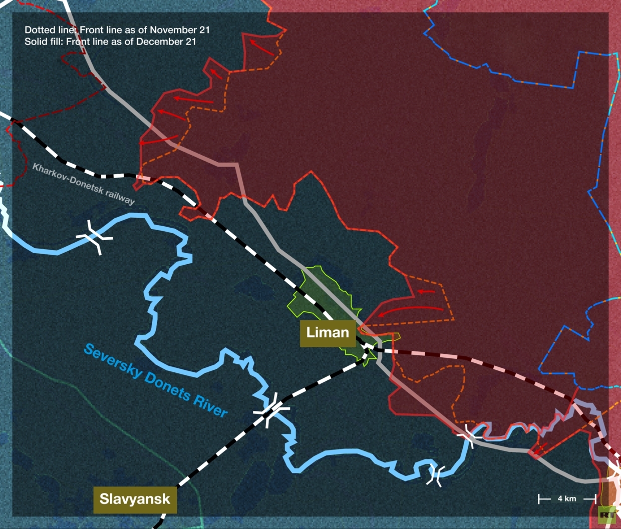 Der östliche Teil der Stadt, in dem sich ein wichtiger Eisenbahnknotenpunkt befindet, blieb jedoch unter ukrainischer Kontrolle (3); bis zu 3.500 Soldaten waren dort operativ eingekesselt.