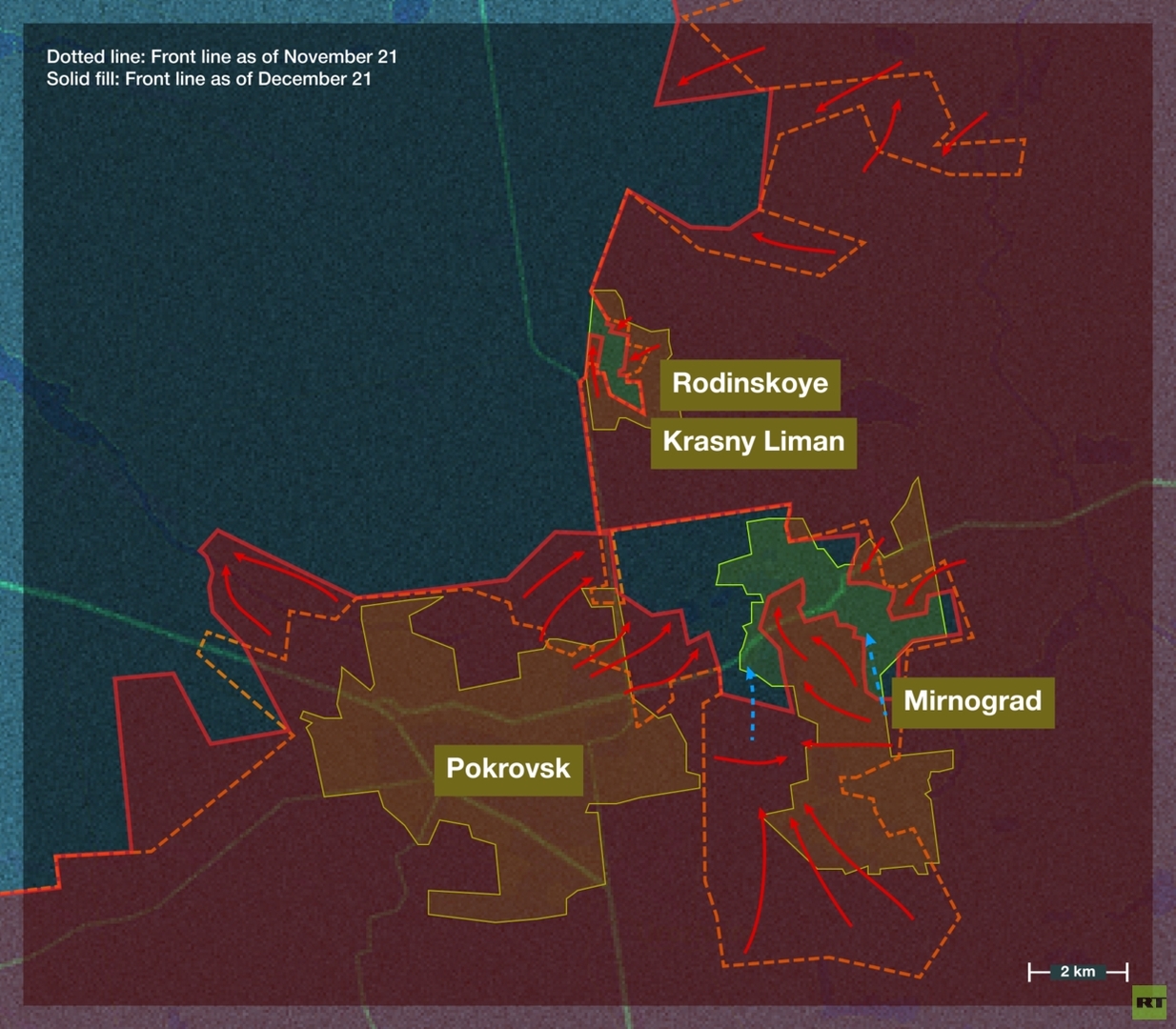 Zweitens befreite die russische Armee Ende November Pokrowsk vollständig. Dadurch entstand eine enge physische Einkesselung (erstmals seit den Kämpfen um Mariupol), die die Garnison in Mirnograd einschloss. Hunderte ukrainische Soldaten ergaben sich, einigen Dutzend gelang die Flucht über die Felder; das Schicksal der Übrigen ist ungewiss.