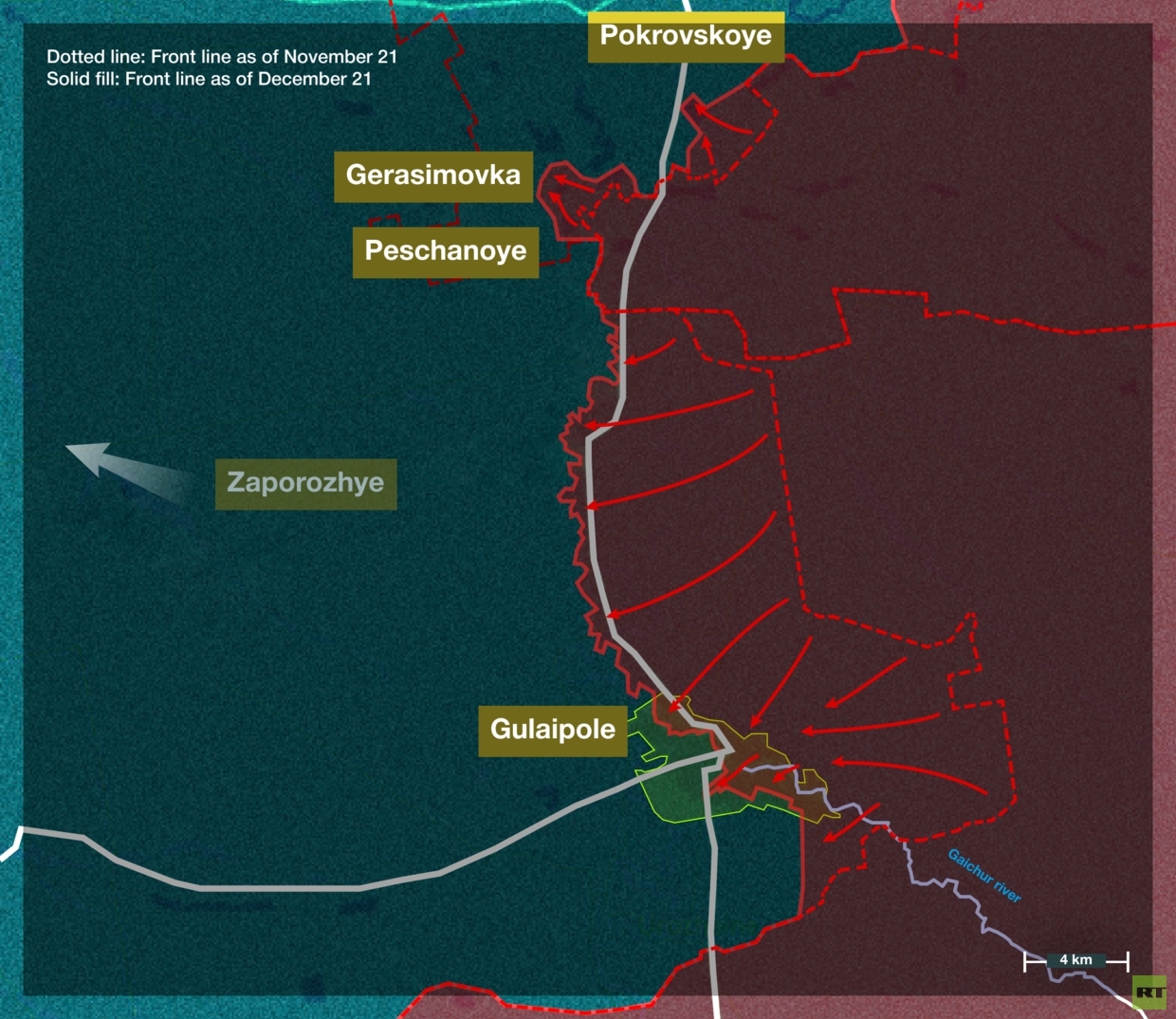 In den vergangenen Monaten wurde der größte Vormarsch der russischen Armee zwischen Gulaipolje in der Region Saporoschje und Pokrowskoje in der Region Dnepropetrowsk verzeichnet. Diese Front ist aus zwei Gründen entscheidend: Erstens verläuft sie entlang einer der wichtigsten Verteidigungslinien der Ukraine und macht diese damit weitgehend wirkungslos.