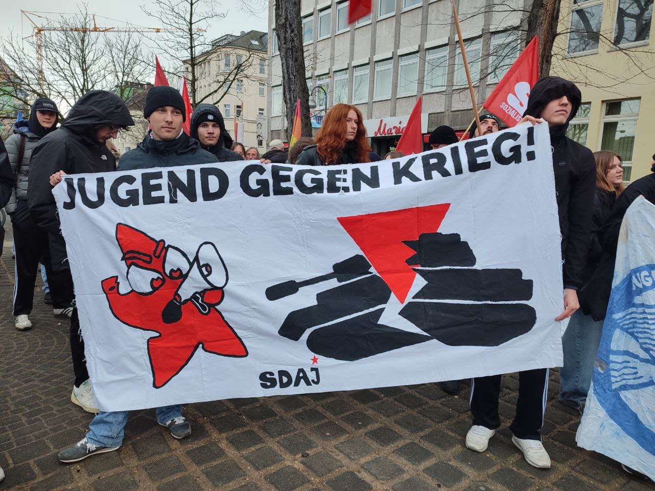 Eine Jugend, die es den Herrschenden nicht wert sei, für würdige Lernbedingungen zu sorgen, solle nun dafür eingesetzt werden, auf Menschen in anderen Ländern zu schießen. Dabei hätten die Jugendliche aus Deutschland mit den jungen Menschen aus anderen Ländern mehr gemeinsam als mit irgendwelchen Superreichen, die vom Krieg profitieren würden.