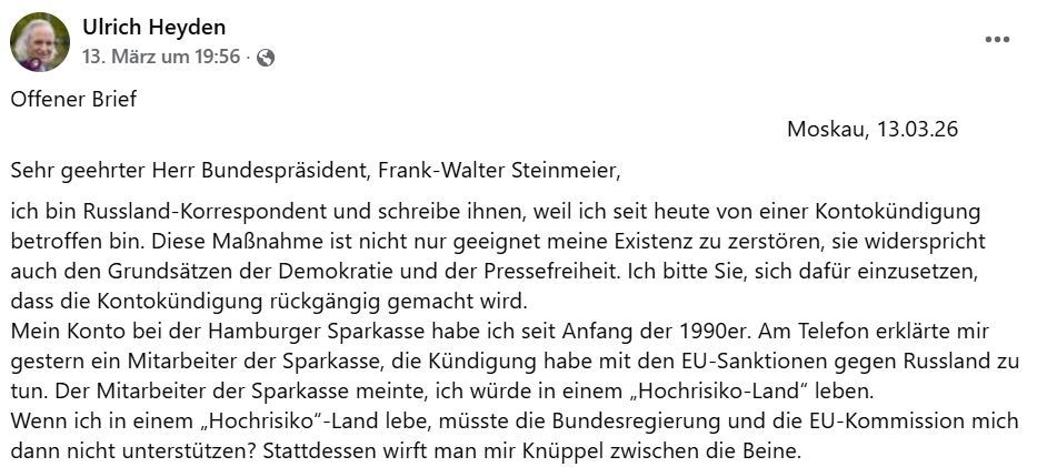 Die Hamburger Sparkasse hat dem in Russland lebenden Journalisten Ulrich Heyden das Konto gekündigt. Damit wird ihm seine Existenz-Grundlage entzogen. Der Journalist wandte sich nun mit einem offenen Brief an den Bundespräsidenten.
