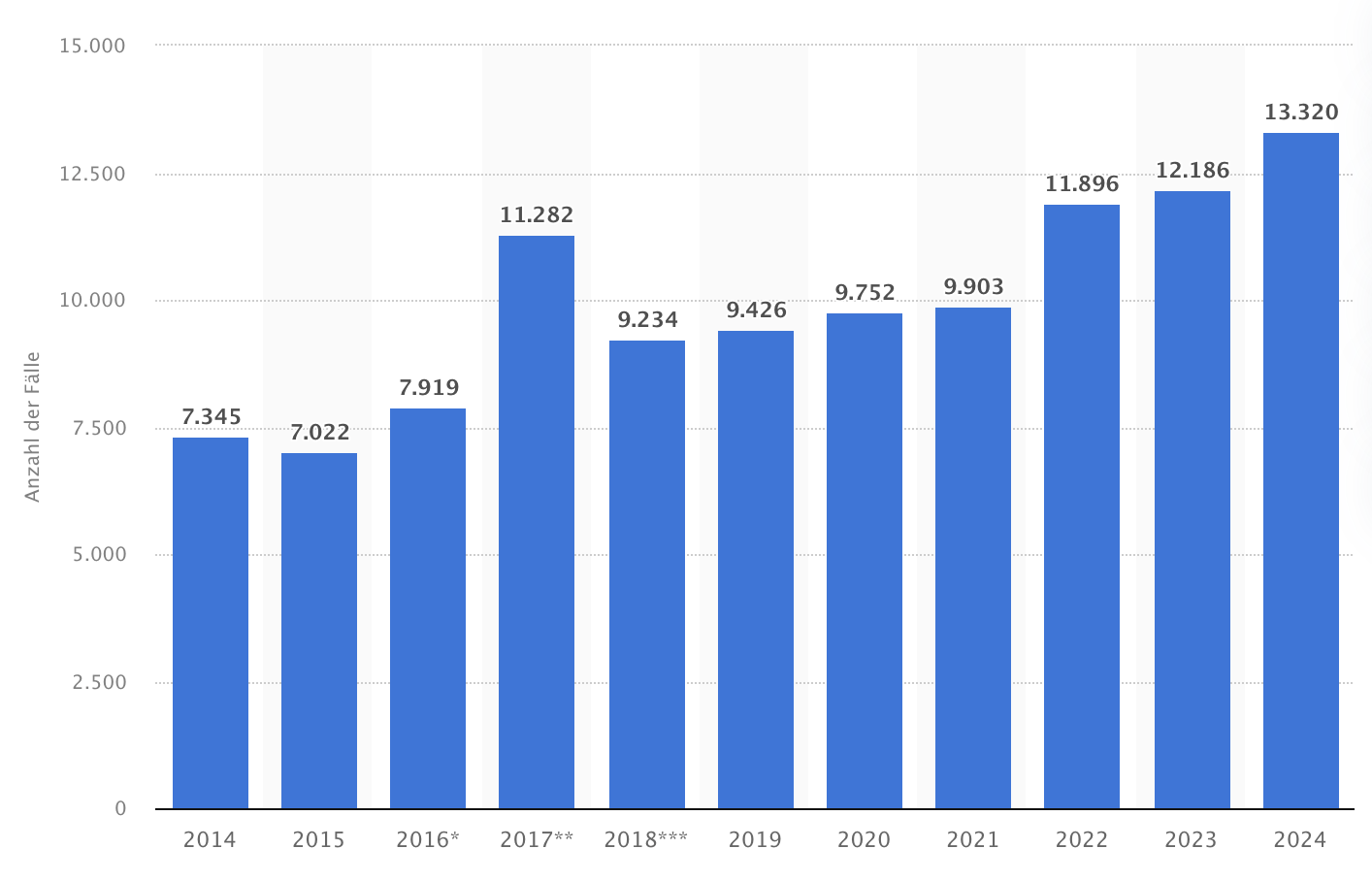 Im Jahr 2024 wurden rund 13.300 Fälle registriert – das sechste Jahr in Folge mit steigenden Zahlen und ein neuer Höchststand. Viele Delikte bleiben unerfasst.