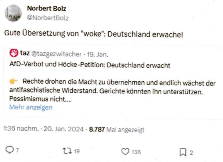 “Bolz hingegen verweist auf den Kontext seines Beitrags: ‘Ich hielt das für einen guten Witz. Die Taz hatte etwas über Höcke geschrieben, mit dem Fazit ‘Deutschland erwacht’. Ich dachte: Das ist eigentlich eine gute Definition von ‘woke’. Denn ‘woke’ heißt ja auch ‘erwacht’.”