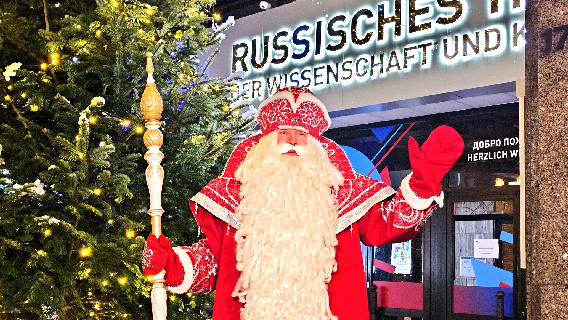 Berlin-Mitte, Friedrichstraße – beste zentrale Lage der Stadt – der Gendarmenmarkt um die Ecke und bis Unter den Linden sind es nur fünf Minuten zu Fuß. An diesem Tag in der ersten Dezemberhälfte stehen wir vor dem Russischen Haus und es ist kurz vor vier Uhr nachmittags. Es dämmert, der geschmückte Christbaum vor dem Eingang und unaufdringlich leichte Weihnachtsmusik machen die Stimmung feierlich. Papas und Mamas mit Kindern gehen ein und aus, noch ist hier normaler Betrieb: Sprach-, Mal- und Bastelkurse, verteilt über fünf Etagen des Hauses. Aber in zweieinhalb Stunden beginnt im Foyer eine russische Märchenstunde: Djed Moroz – zu Deutsch Väterchen Frost – kommt höchstpersönlich mit seiner Snegurotschka zu Besuch.