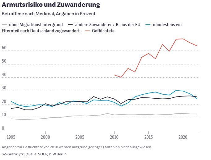 Die Süddeutsche Zeitung zitiert vorab Daten aus einer Studie des Deutschen Instituts für Wirtschaftsforschung (DIW) zum Thema “Einkommensungleichheit und Armutsrisiko” (Bezahlschranke). Laut SZ-Resümee würde sich in der Untersuchung darlegen, dass die Entwicklung des Armutsrisikos in Deutschland “stark durch Zuwanderung geprägt ist.” Bei annähernd gleichbleibenden Zahlen bei den Menschen ohne ausländische Wurzeln, zeige sich “bei den Geflüchteten dagegen ein drastischer Anstieg”, mit einem Spitzenwert von “fast 70 Prozent im Jahr 2020”. Dieser Wert würde nun durch statistische Tricks, ausgehend “der zunehmenden Arbeitsmarktintegration” in Minijobs und im Niedriglohnsektor, als “gute Nachricht” wieder “etwas sinken”.