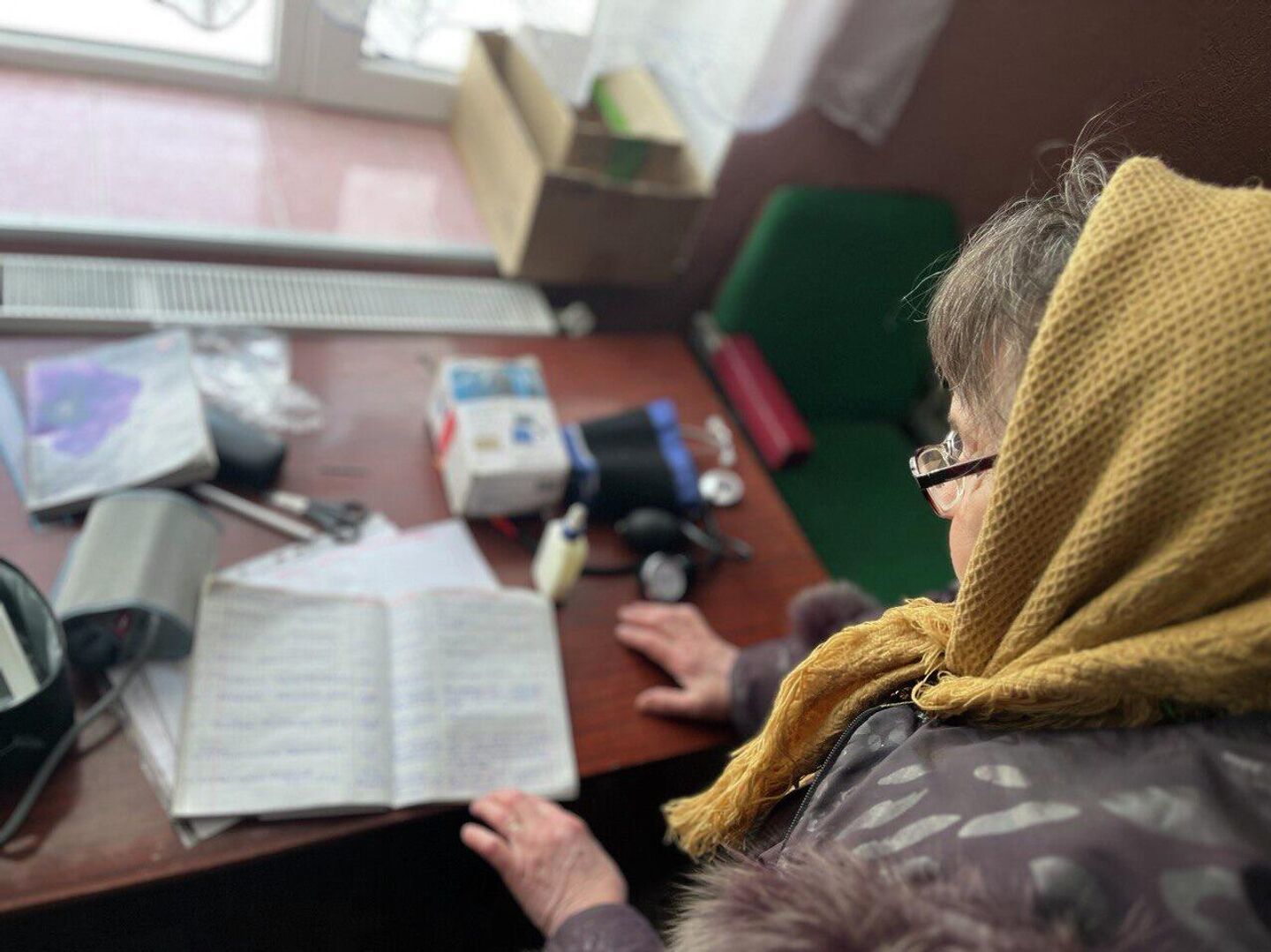 Bis zur Gesundheitsstation zu kommen, ist für sich schon ein großes Glück – ukrainische Drohnenpiloten machen zwischen Militärangehörigen und Zivilisten keinen Unterschied. Tatjana Iwanowna erzählt, während sie in ihrem Dienstbuch blättert: