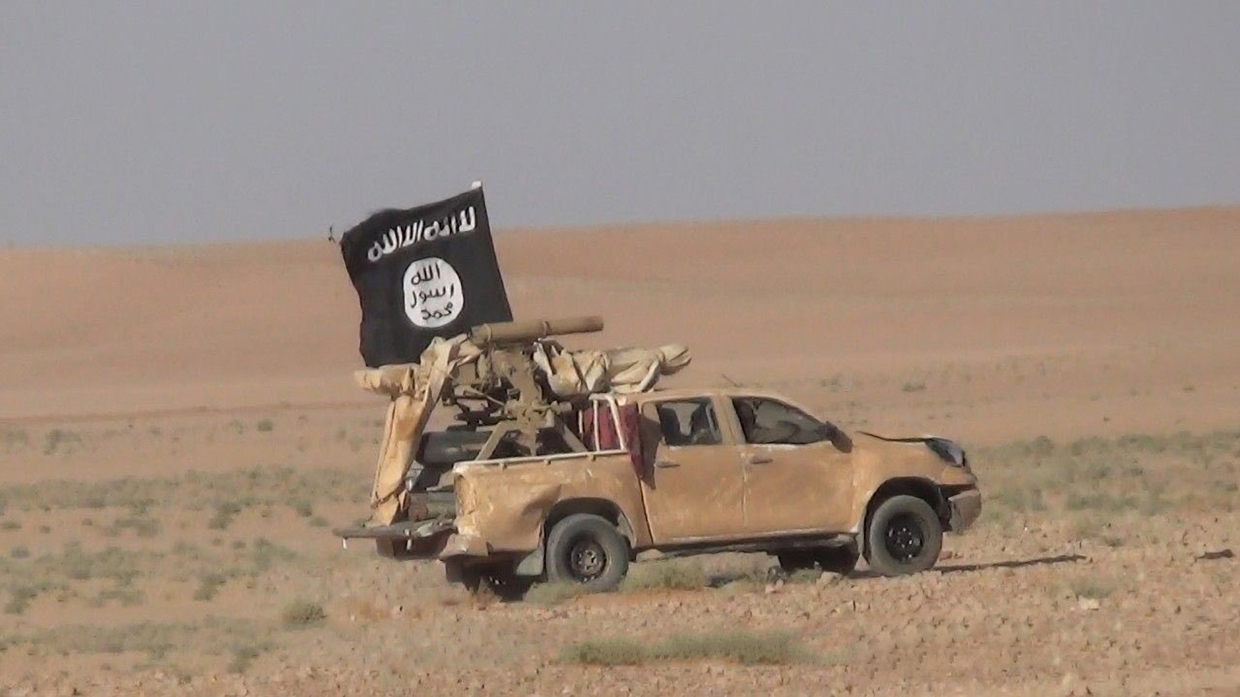 Ein Standbild aus einem Propagandavideo des “Islamischen Staates”, das IS-Kämpfer in einem Pick-up-Truck vor Al-Qaryatain zeigt (10. Oktober 2017)