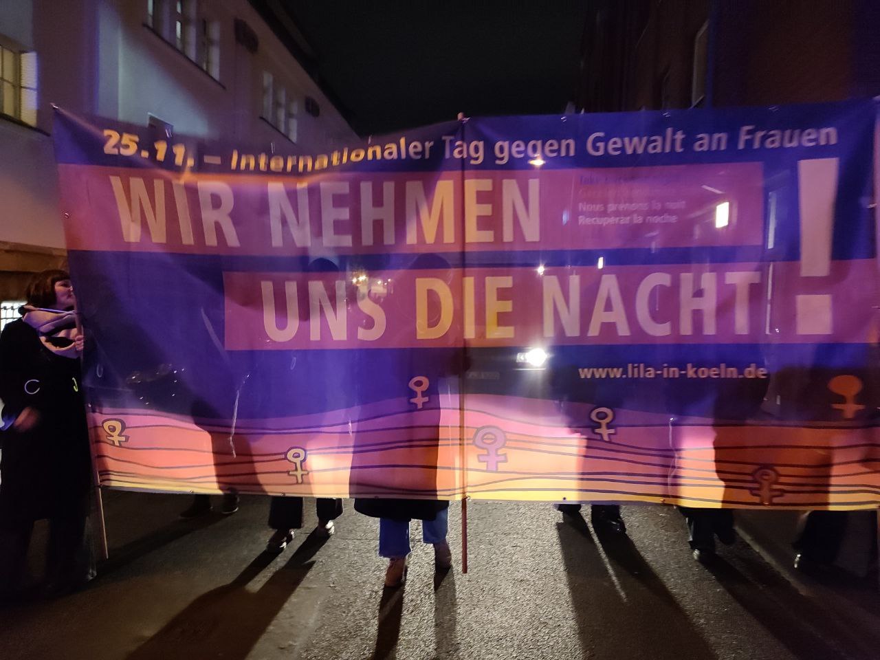 Das Bündnis Lila in Köln veranstaltete am Dienstagabend unter dem Motto “Wir nehmen uns die Nacht zurück” eine Demonstration gegen Gewalt an Frauen und Mädchen. Rund 2000 Teilnehmerinnen und Teilnehmer protestierten im Kölner Stadtteil Ehrenfeld lautstark gegen die nicht abnehmende Gewalt an Frauen und Mädchen in Deutschland und weltweit. Auf der Kundgebung setzten sich die Rednerinnen auch gegen Diskriminierung und Gewalt an Menschen mit transsexuellen Identitäten ein.