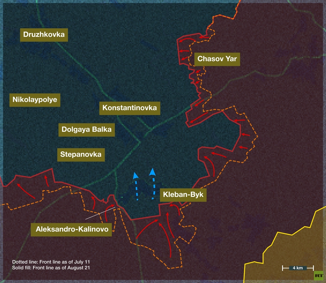 Die Russen überquerten den reißenden und breiten Fluss Sewerski Donez und errichteten einen festen Brückenkopf bei Sewersk, wodurch die Nachschublinien der Stadt unterbrochen wurden. Gleichzeitig eroberten sie Siedlungen südlich der Stadt und brachten die ukrainische Garnison in eine verzweifelte Lage.