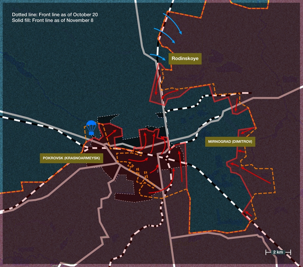 Die Front rückte im vergangenen Jahr nahe an Pokrowsk heran, doch die Kämpfe um die Stadt selbst begannen erst im Sommer 2025. Nach mehreren erfolglosen Versuchen eroberten russische Truppen den südlichen Teil der Stadt, während der Feind im Norden heftigen Widerstand leistete. Die Einnahme Pokrowsks schloss zudem die ukrainische Garnison im benachbarten Mirnograd ein; dies geschah Mitte Dezember, nachdem russische Truppen die nördlichen Außenbezirke der Stadt endgültig unter ihre Kontrolle gebracht hatten.