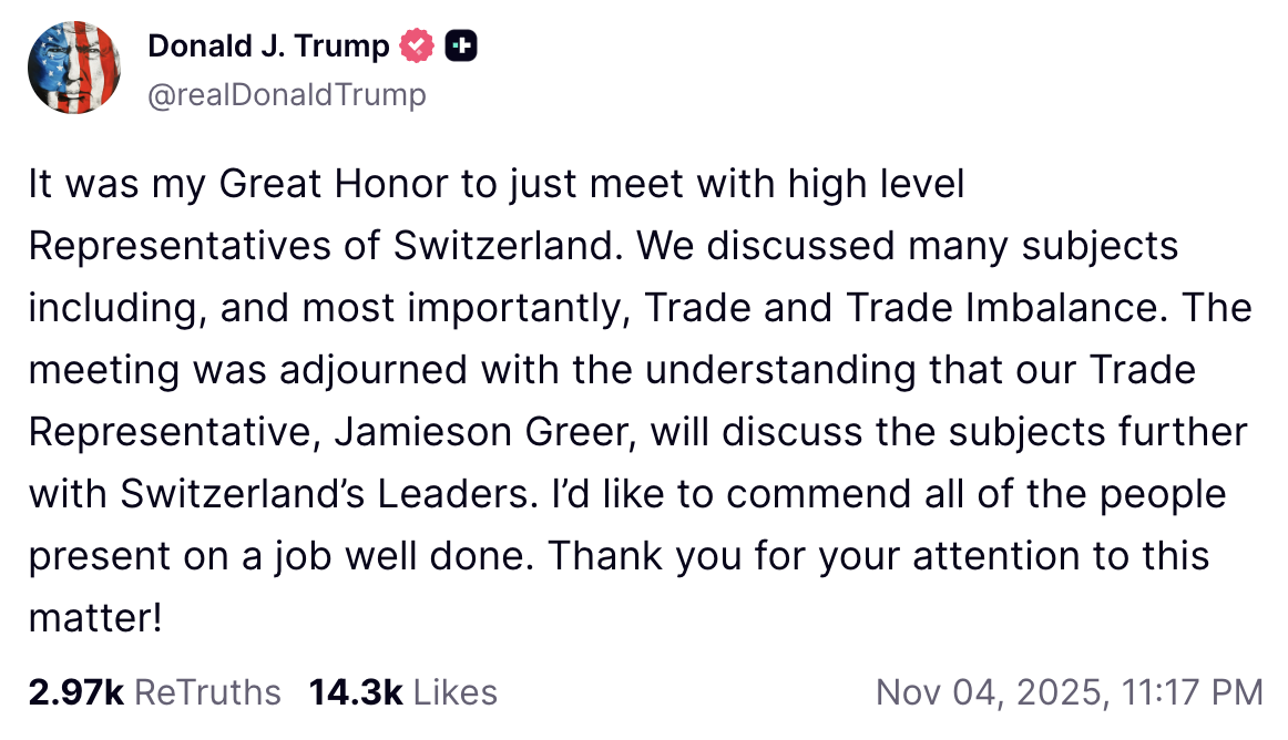 In Washington kam es nun zu einem Austausch zwischen führenden Schweizer Wirtschaftsvertretern und Trump. Auf Truth Social erklärte der Präsident, man habe vor allem über Fragen des Handels gesprochen, und er würdigte die Delegation für ihr Engagement. Sein Handelsbeauftragter Jamieson Greer soll die Gespräche auf Arbeitsebene fortführen.